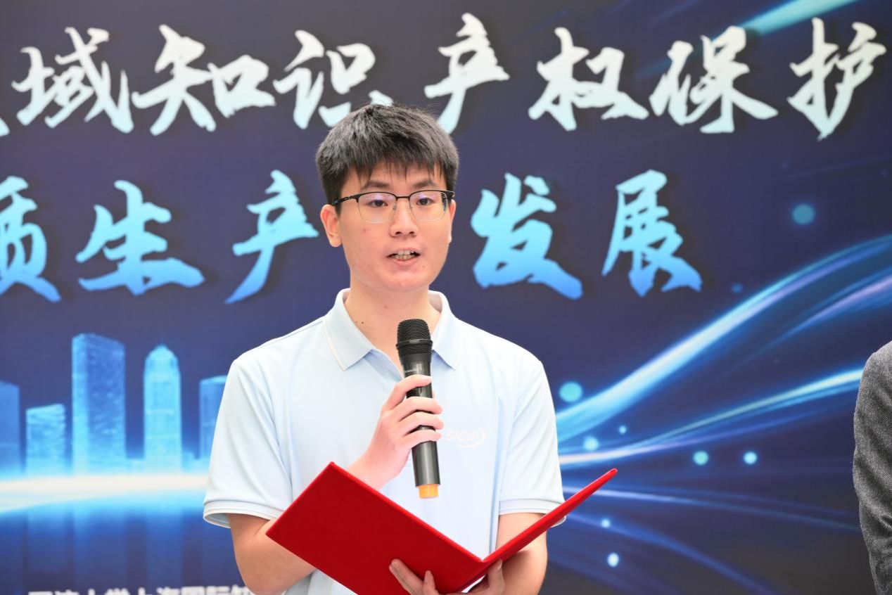上海国际知识产权学院硕士研究生朱怀阳作为学生代表,向全体同学发出倡议。第一,深耕专业本源,夯实创新理论根基,把专业学习与国家战略、产业需求紧密结合;第二,践行知行合一,投身创新活动,在实践中赋能新质生产力;第三,恪守执业准则,弘扬创新法治文化,做知识产权的守护者与传播者。